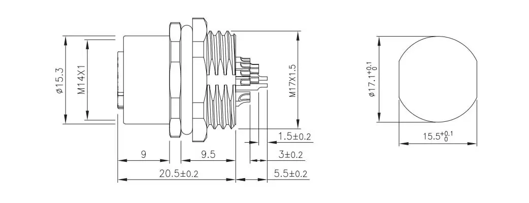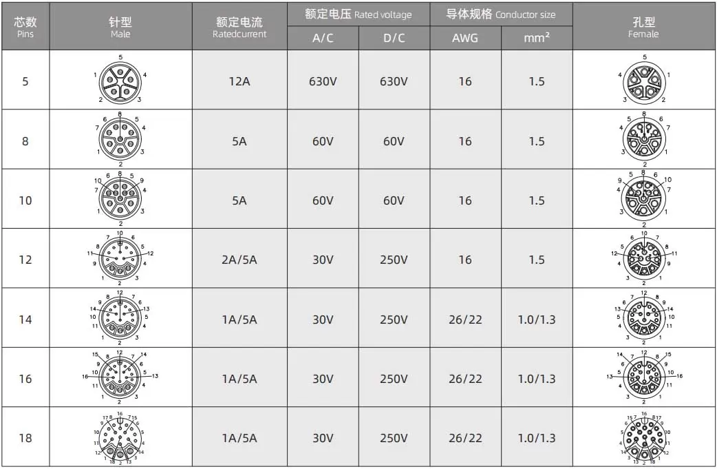 Europese standaardconnector M14-serie Structuurtype: stekker voor montage aan de voorkant Pintype: vrouwelijk type Contactnummer: 2,3,4,5,8,12,14,19pins Verbindingsmethode: soldeer Afscherming: Nee Certificering: CE,ROHS,UL, Norm: IEC 61076-2-101