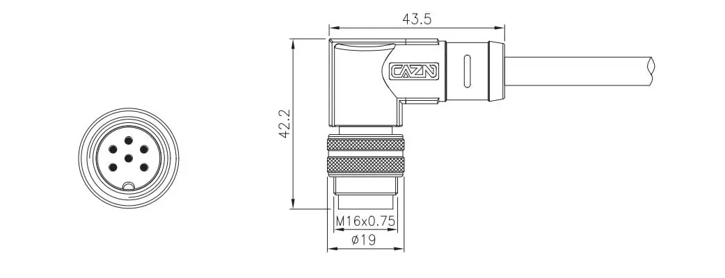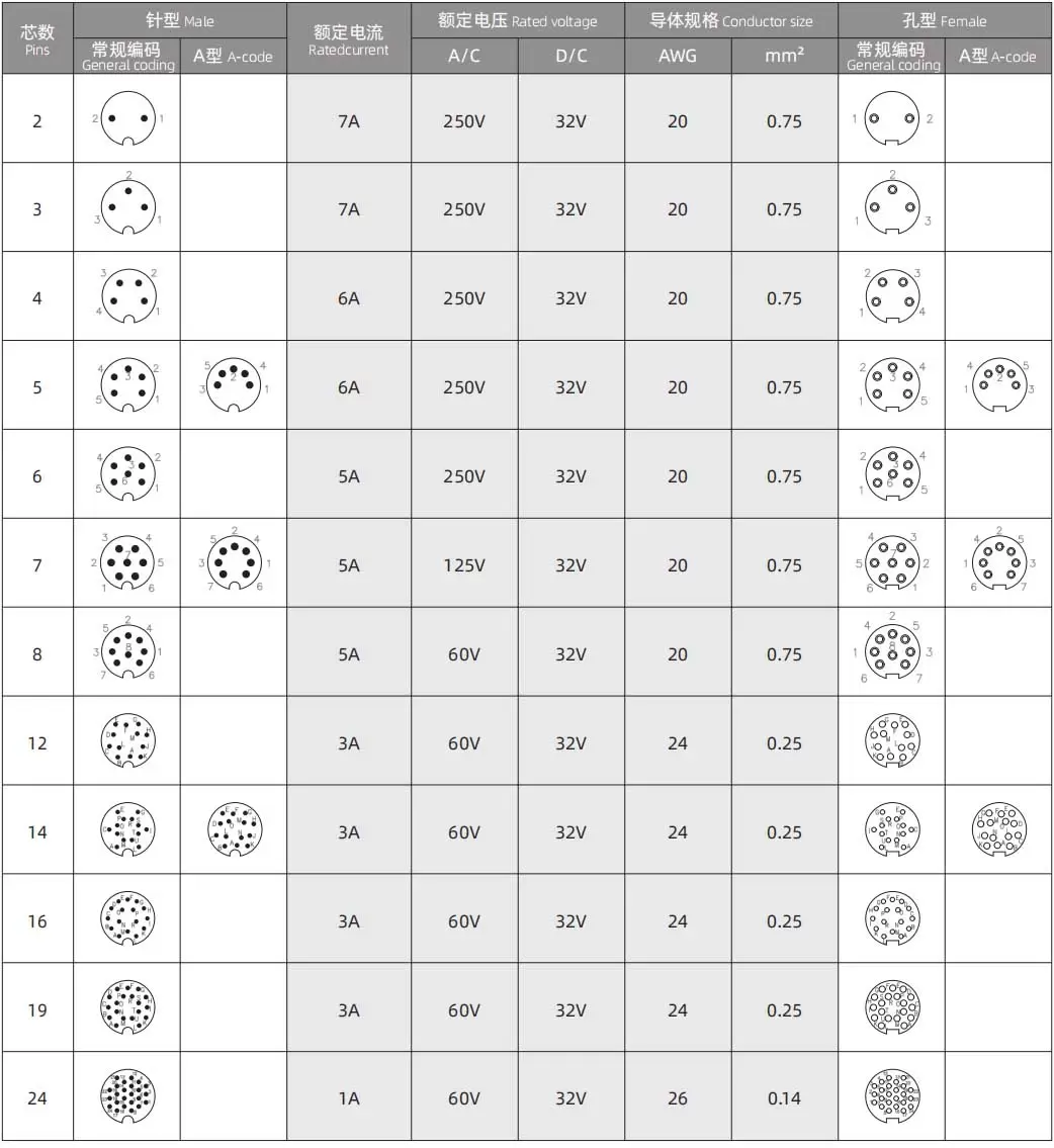 Europese standaardconnector M16-serie, structuurtype: schuine overmolded stekker Pintype: mannelijk Contactnummer: 2,3,4,5,6,7,8,12,14,16,19,24 pins Aansluitmethode: Soldeer Afscherming: Ja /NO-certificering: CE, RoHS, UL,