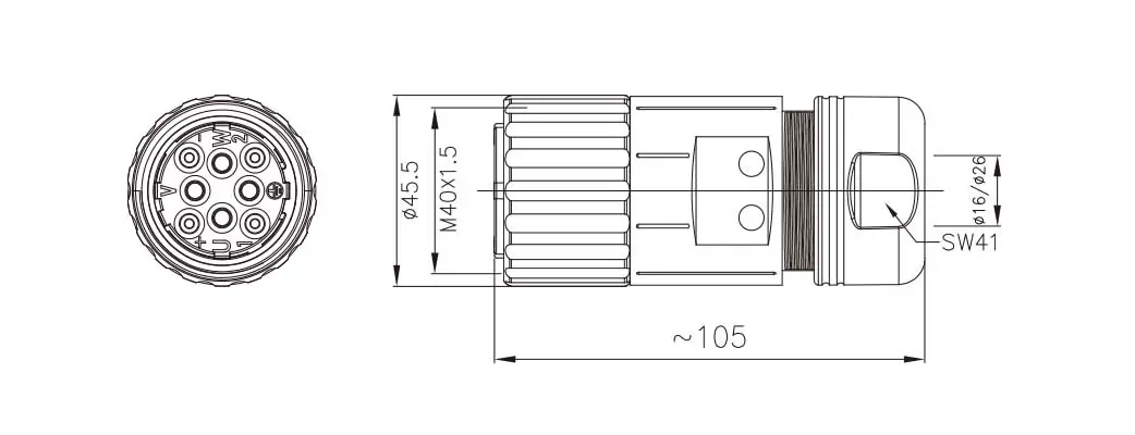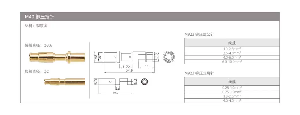Europese standaardconnector M40-serie Structuurtype: metalen geassembleerde stekker Pintype: vrouwelijk Contactnummer: 6,8 pins Verbindingsmethode: krimp Afscherming: Ja Certificering: CE, RoHS, UL, Standaard: IEC 61076-2-101